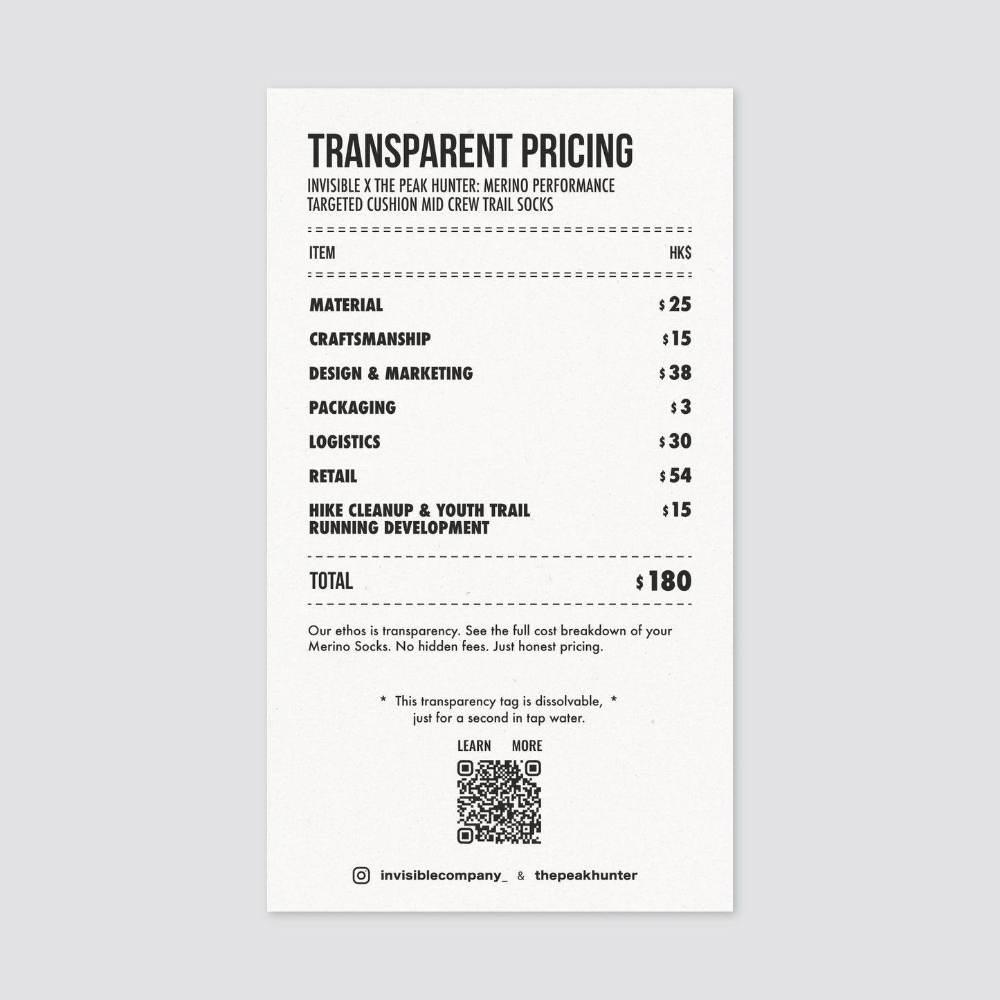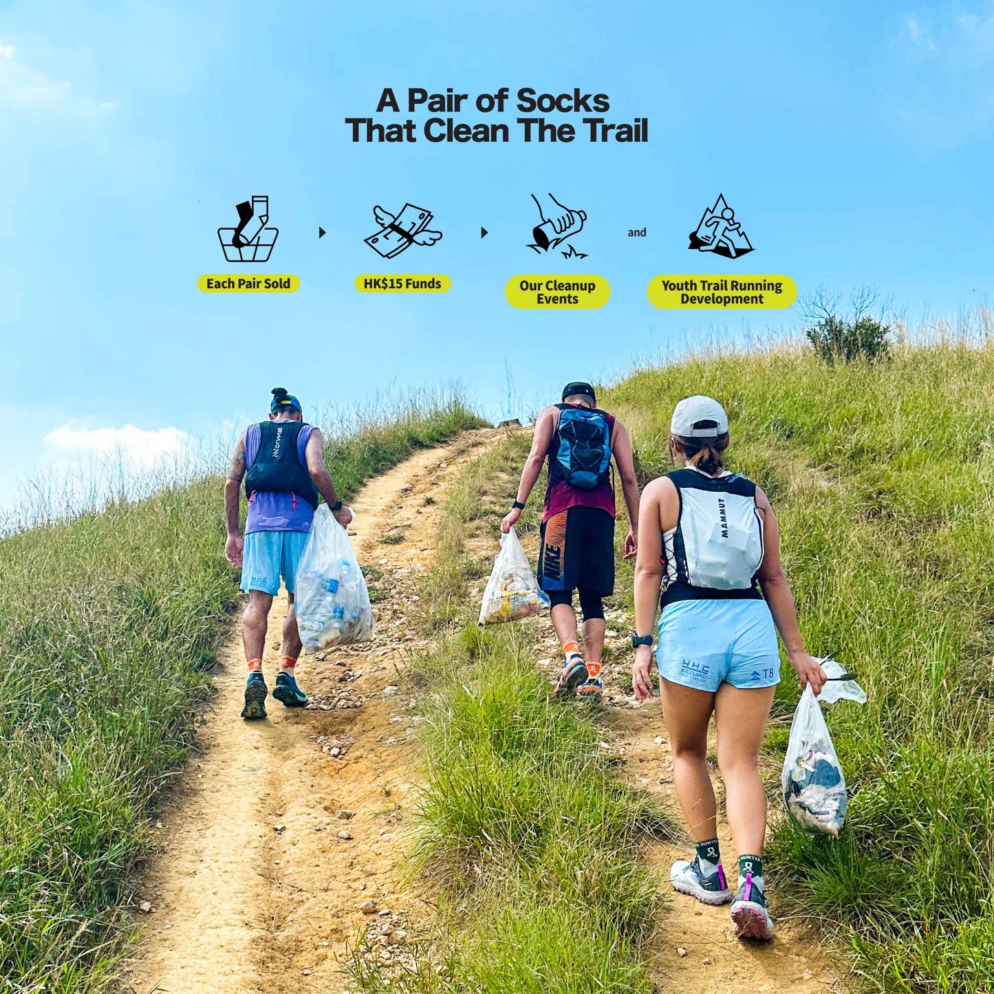 這對美麗諾羊毛越野跑襪不僅是您的裝備,更是對抗塑膠垃圾污染和支持社區發展的力量!每售出一對,HK$15 將直接用於支持 The Peak Hunter的青少年越野跑發展計劃,以及我們 Invisible 團隊的淨山活動,支持那些在週末修復山徑的義工朋友。每購買一對,您都在幫助我們推動淨山抵消計劃,並啟發大家對環境保護的關注。穿上它,加入我們的行動,讓山徑變得更加乾淨,成為 「Invisible Trail」。