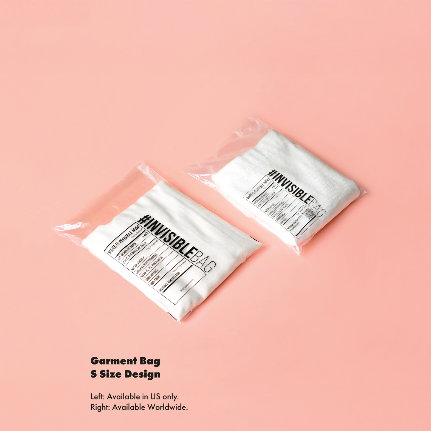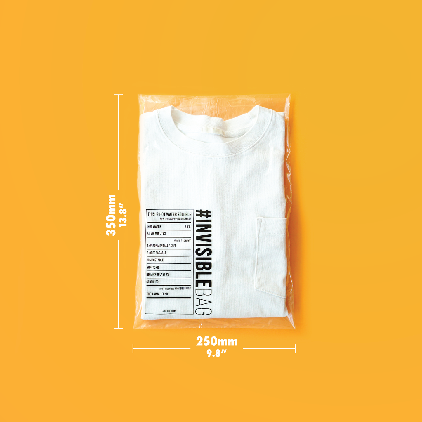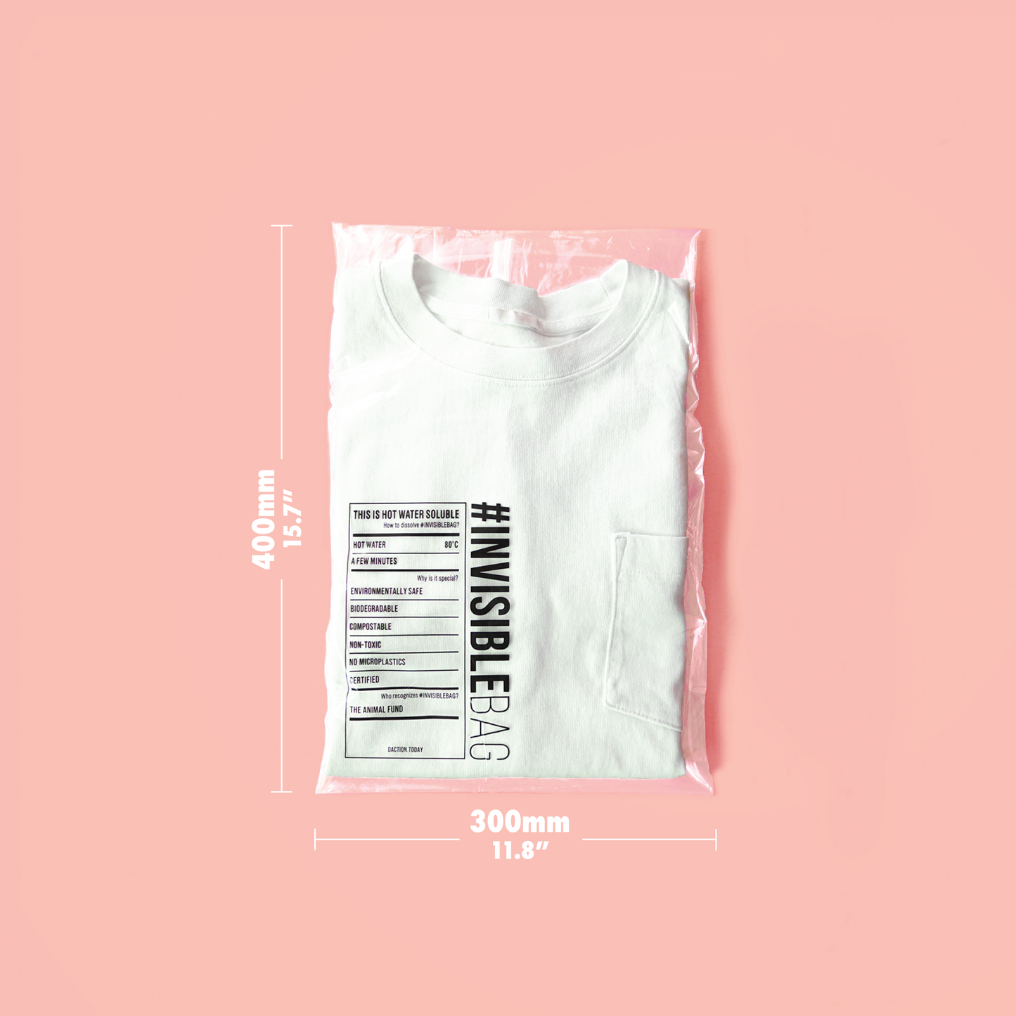 在袋的表面會印上有我們標誌性的 #INVISIBLEBAG 標籤,當中會說明如何溶解 #INVISIBLEBAG,以及為何這包裝對您的客戶來說是特別的。印刷顏色為黑色。