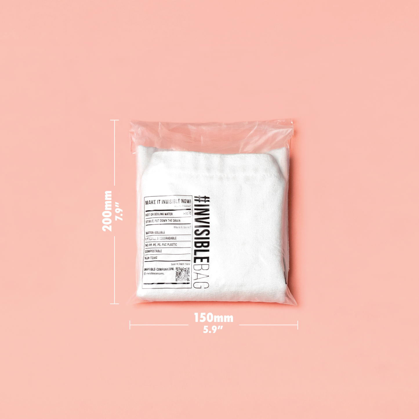 #INVISIBLEBAG 是由水溶性及可生物降解物料所造:聚乙烯醇 (PVOH)、植物澱粉,甘油和水。它的主要成份聚乙烯醇 (PVOH) 是一種具水溶性,及可被生物降解的合成聚合物;此物料早於 1920 年代由德國科學家所發明,擁有悠久的安全使用歷史,在過去 60 年來廣泛被應用在醫療、刺繡、服裝、農業等應用,例如,藥丸膠囊、洗衣球等。它亦被應用於多種個人護理產品上﹐包括撕拉式面膜、保濕霜、睫毛膏、隱形眼鏡和人工淚液。這是一個經測試的可生物降解解決方案,不留任何有害的微塑膠。